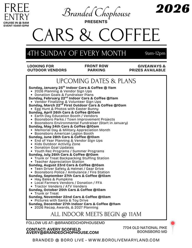 At Branded Chophouse, community is at the heart of everything we do. We proudly support local businesses, host family friendly events, and give back through fundraisers, food drives, and environmental initiatives! Whether it's Cars & Coffee, Breakfast with Santa, Craft Nights, or sponsoring local Athletes, we create opportunities for our neighbors to come together. We invite community partners and sponsors to join us in making a positive impact right here in Boonsboro!